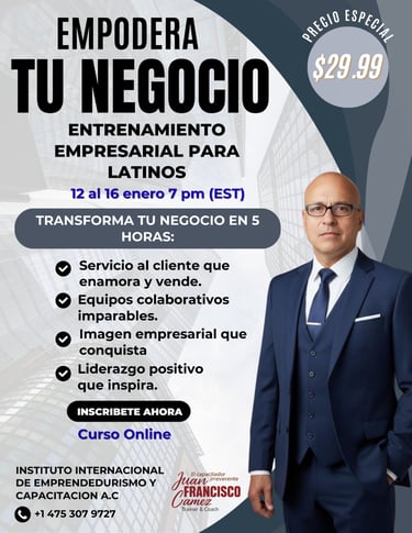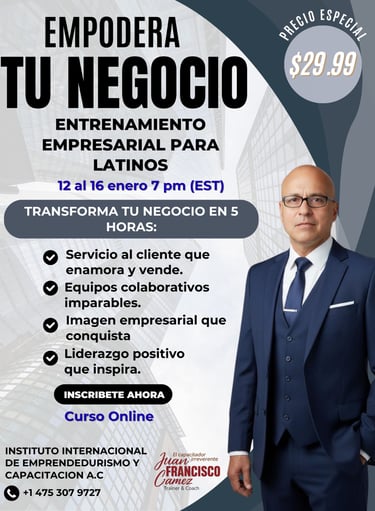 Este entrenamiento empodera a profesionales latinos para crear lealtad con sus clientes, liderar con autenticidad, fomentar equipos colaborativos y proyectar una imagen empresarial sólida que atrae oportunidades.
